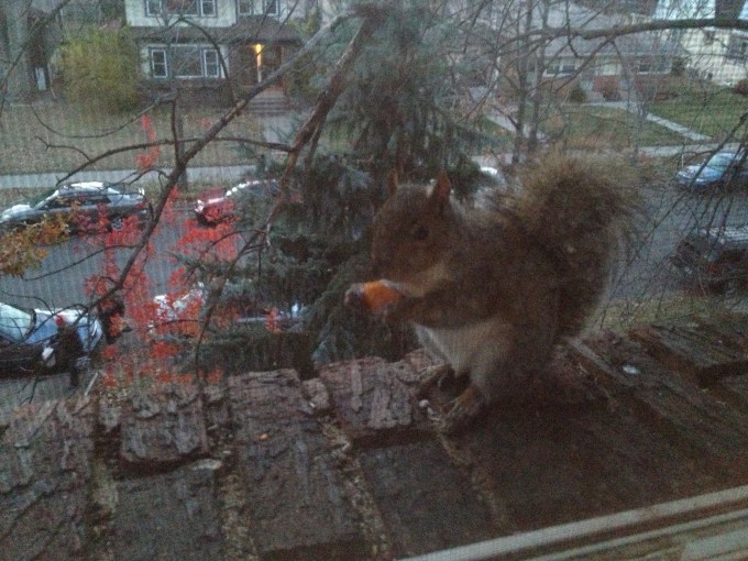 During the game-portion of this week’s episode, we were, for lack of a better phrase, pestered by a squirrel, with its unbearable cuteness, so we had to pay heed to it and bestow crackers upon it. It stuck around for nearly an hour, taking all of our attention off of the show. Cute though. Check out the photos: